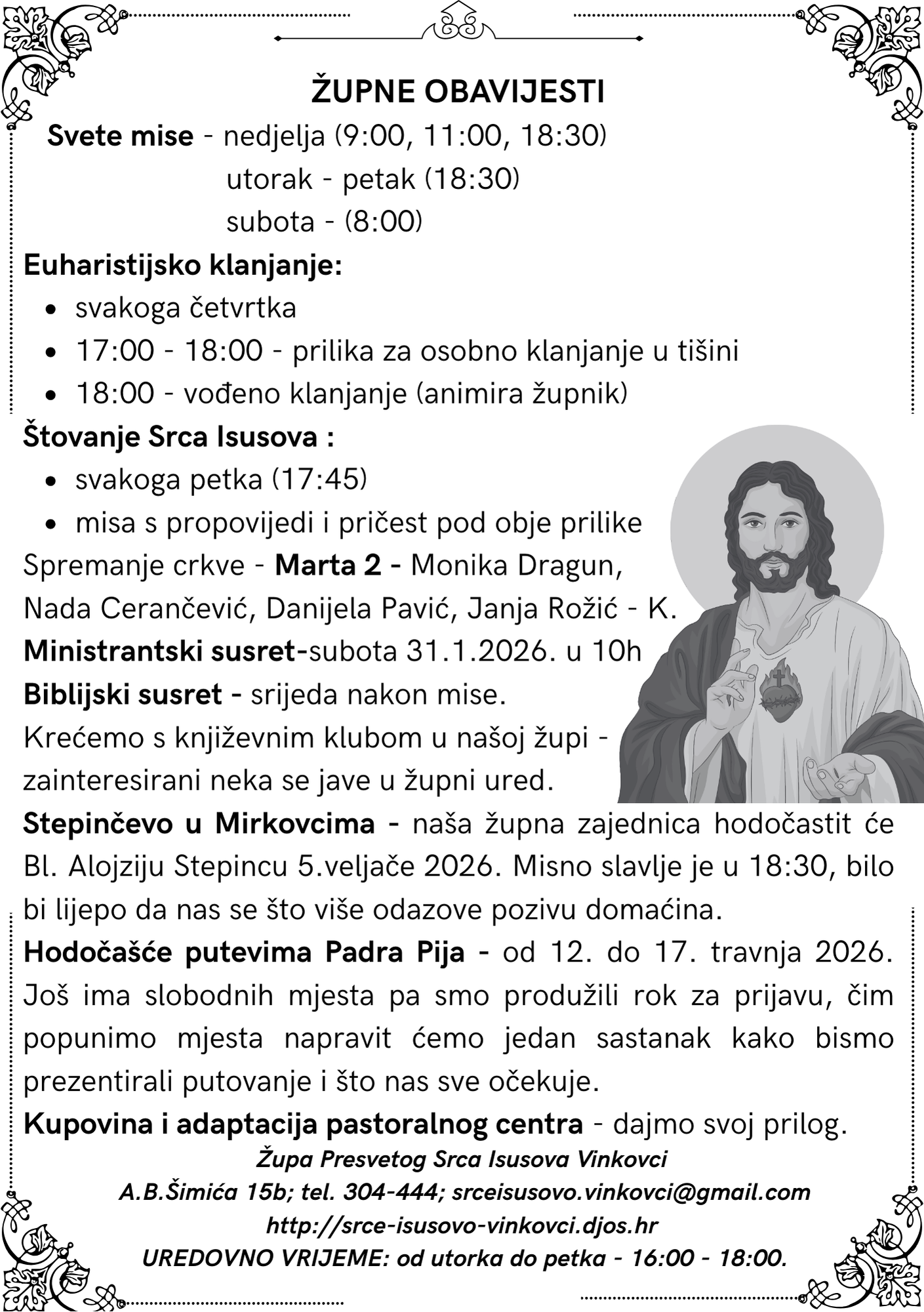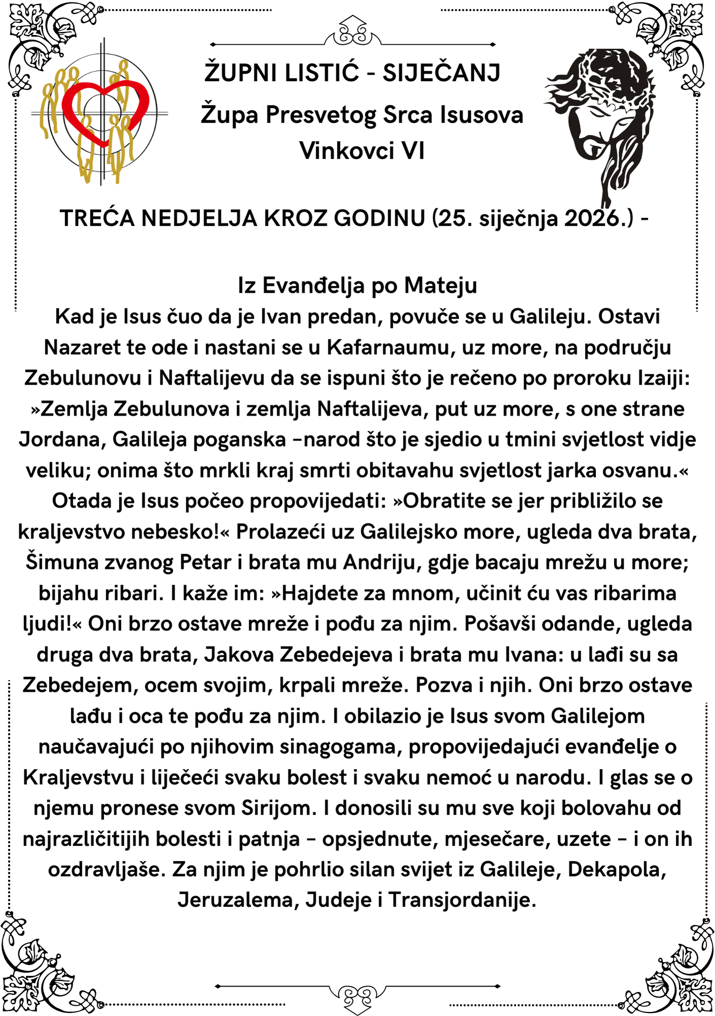 Župne obavijesti Župni listić 24 siječnja, 2026 Župa Presvetog Srca Isusovog Župni listić – treća nedjelja kroz godinu, 25. siječnja 2026. Pročitajte i: Župne obavijesti Župni listić Župni listić – Krštenje Gospodinovo 13 siječnja, 2026 Župa Presvetog Srca Isusovog Župne obavijesti ŽUPNE OBAVIJESTI (kolovoz 2025.) 16 kolovoza, 2025 Župa Presvetog Srca Isusovog