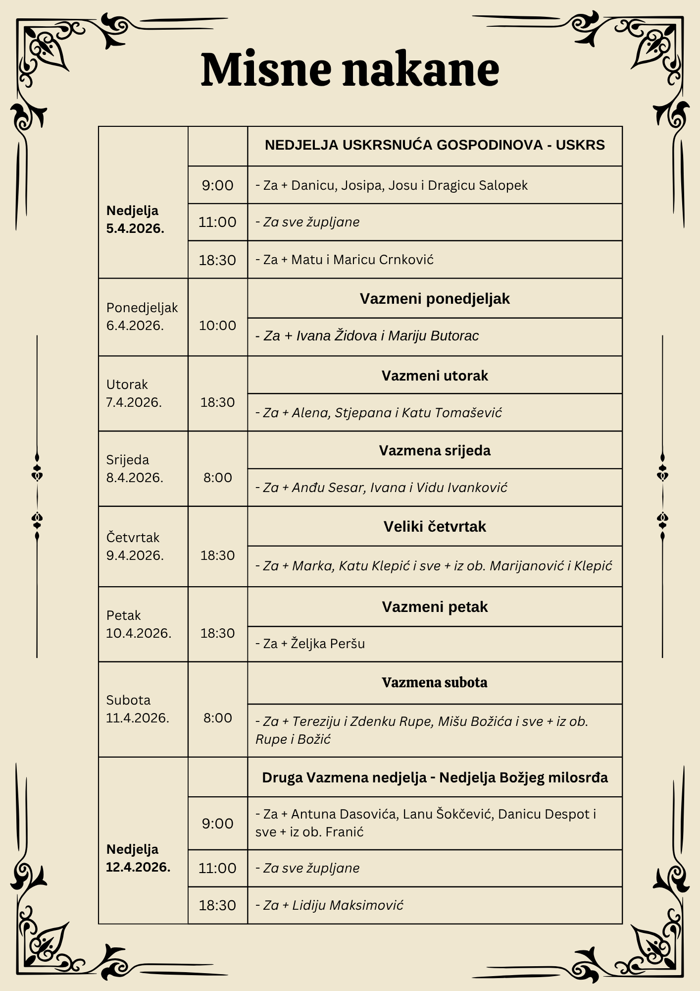 Misne nakane Župni listić Misne nakane od 5. do 12. travnja 2026. 4 travnja, 2026 Župa Presvetog Srca Isusovog Pročitajte i: Župne obavijesti Župni listić Župne obavijesti o Uskrsu 2026. 4 travnja, 2026 Župa Presvetog Srca Isusovog Misne nakane Župni listić Misne nakane od 29. ožujka do 5. travnja 2026. 28 ožujka, 2026 Župa Presvetog Srca Isusovog