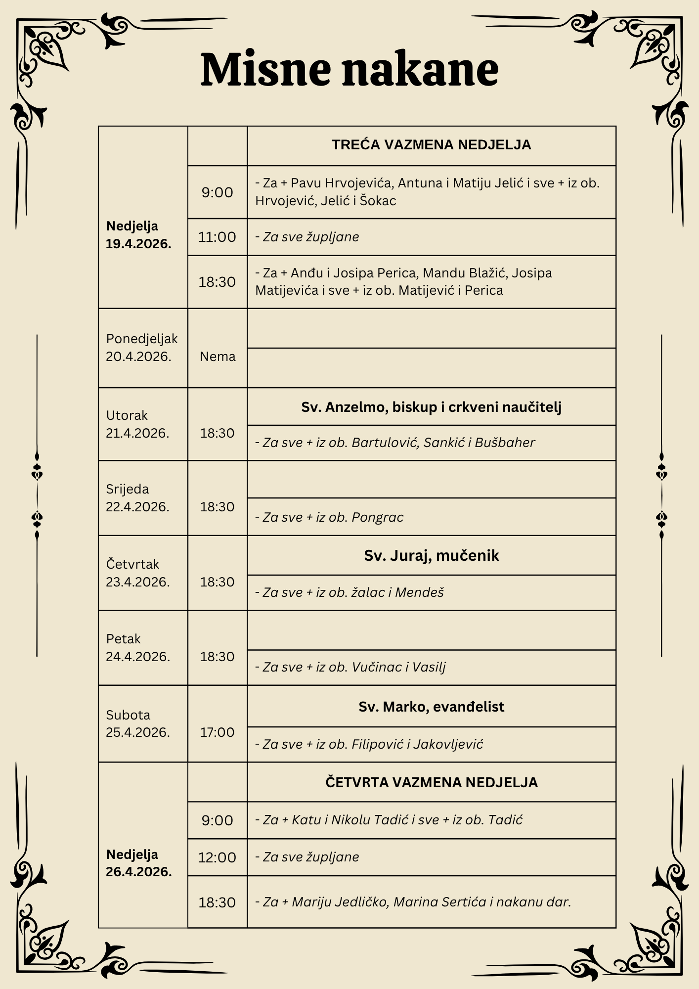 Misne nakane Župni listić Msine nakane od 19. do 26. travnja 2026. 19 travnja, 2026 Župa Presvetog Srca Isusovog Pročitajte i: Župne obavijesti Župni listić Župne obavijesti – Treća Vazmena nedjelja – 19. travnja 2026. 19 travnja, 2026 Župa Presvetog Srca Isusovog Misne nakane Župni listić Misne nakane od 5. do 12. travnja 2026. 4 travnja, 2026 Župa Presvetog Srca Isusovog