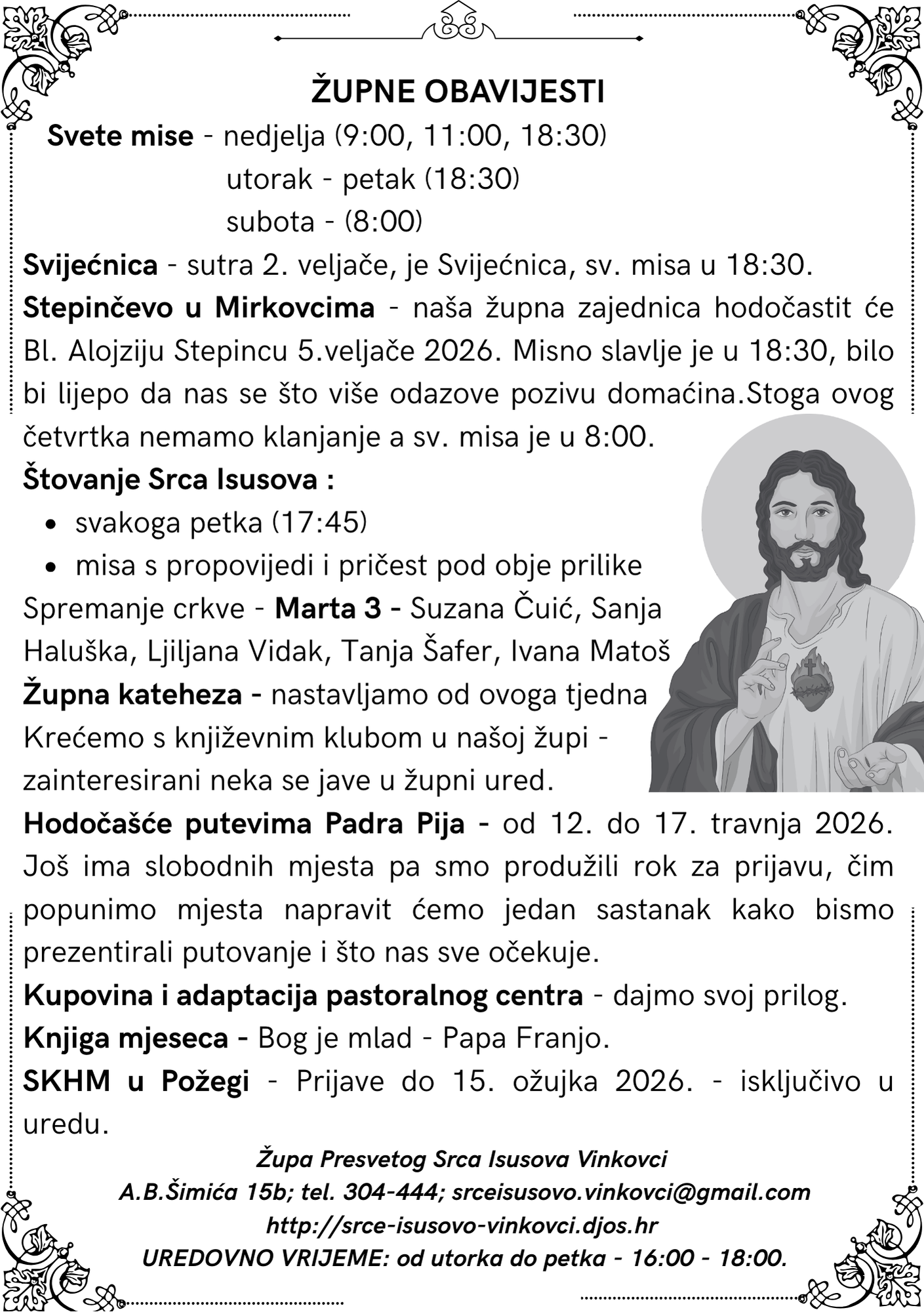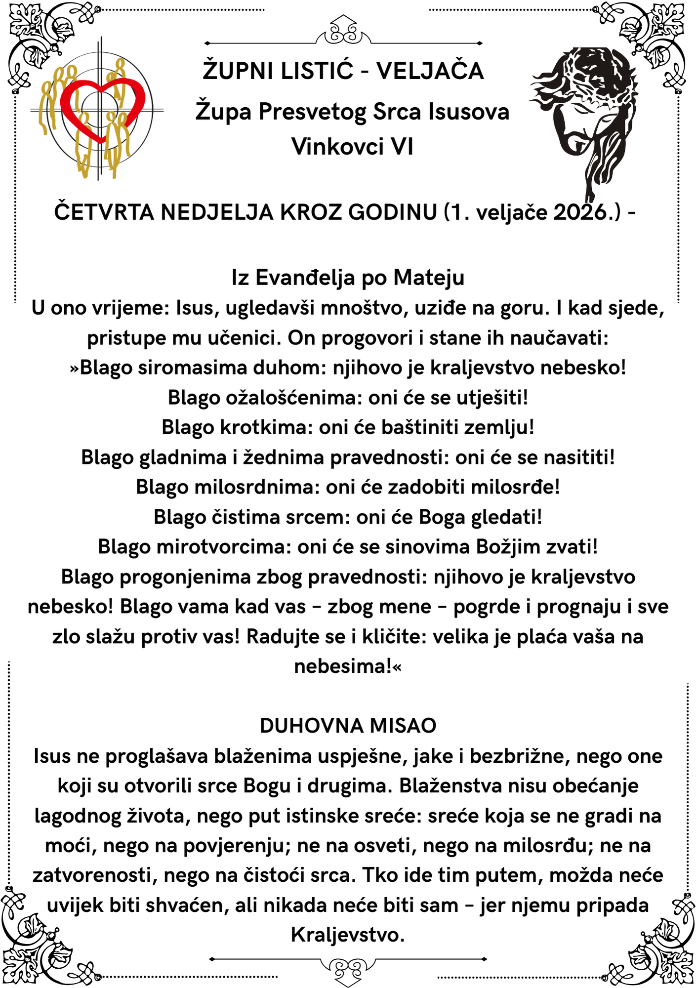 Župne obavijesti Župni listić Župni listić – četvrta nedjelja kroz godinu – 1. veljače 2026. 31 siječnja, 2026 Župa Presvetog Srca Isusovog Pročitajte i: Župne obavijesti Župni listić 24 siječnja, 2026 Župa Presvetog Srca Isusovog Župne obavijesti Župni listić Župni listić – Krštenje Gospodinovo 13 siječnja, 2026 Župa Presvetog Srca Isusovog