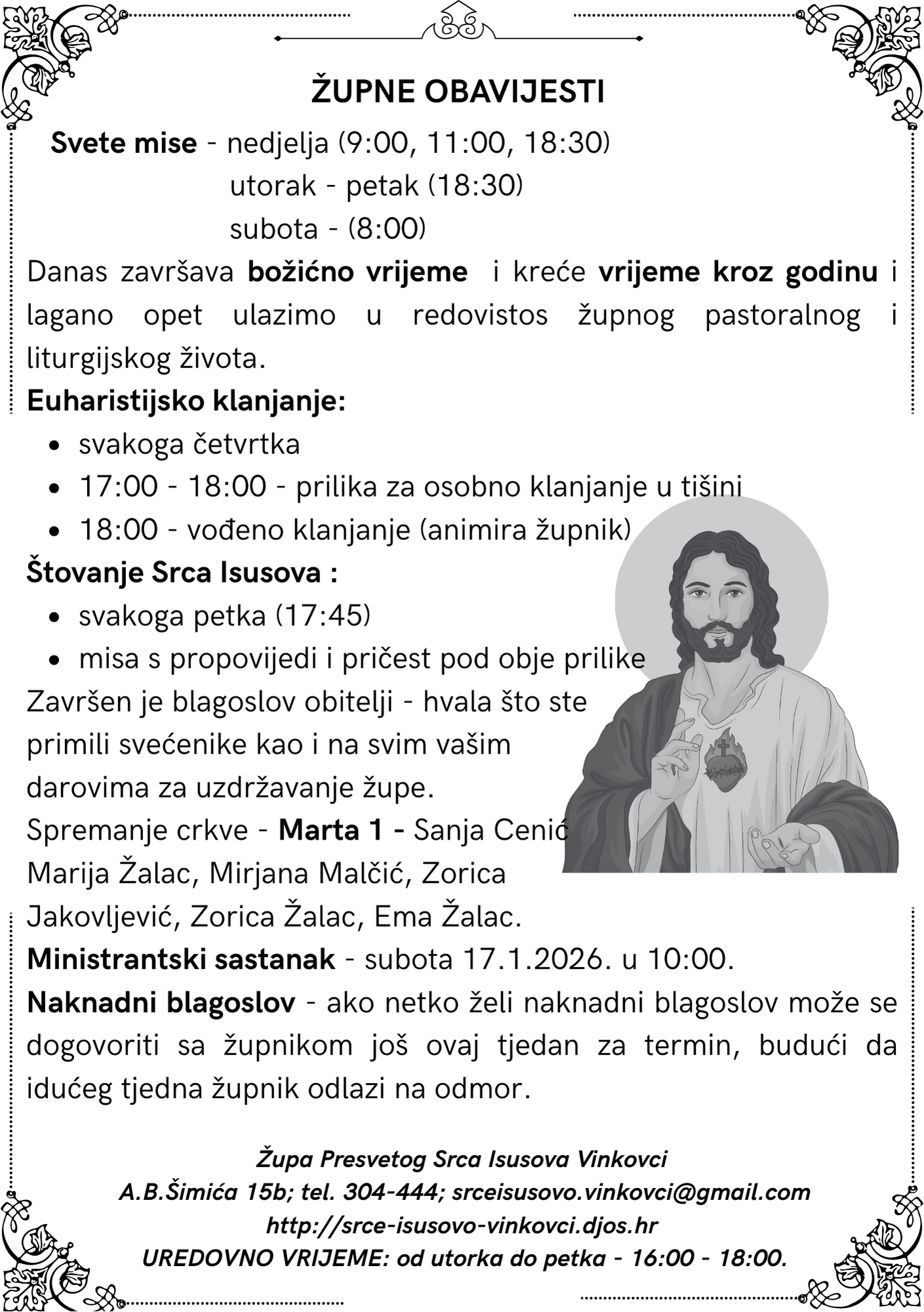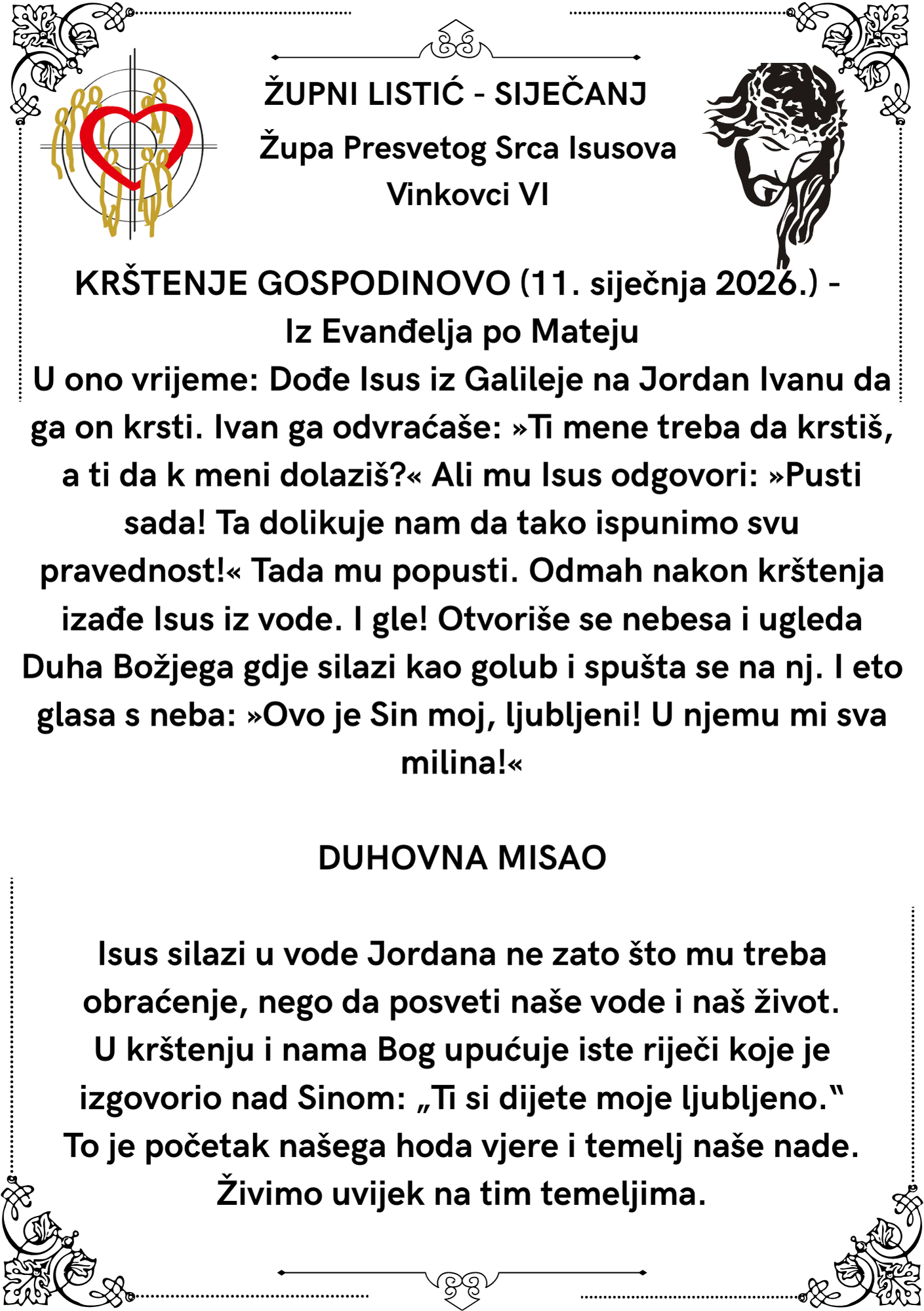 Župne obavijesti Župni listić Župni listić – Krštenje Gospodinovo 13 siječnja, 2026 Župa Presvetog Srca Isusovog Pročitajte i: Župne obavijesti ŽUPNE OBAVIJESTI (kolovoz 2025.) 16 kolovoza, 2025 Župa Presvetog Srca Isusovog Župne obavijesti ŽUPNE OBAVIJESTI (10.- 17. kolovoza 2025.) 9 kolovoza, 20259 kolovoza, 2025 Župa Presvetog Srca Isusovog