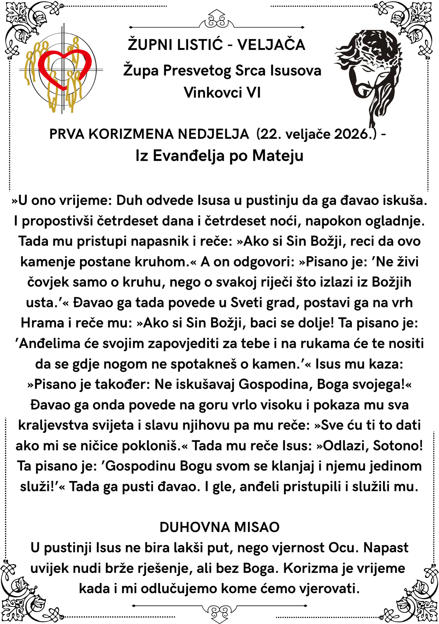 Župni listić – Prva korizmena nedjelja – 22. veljače 2026.